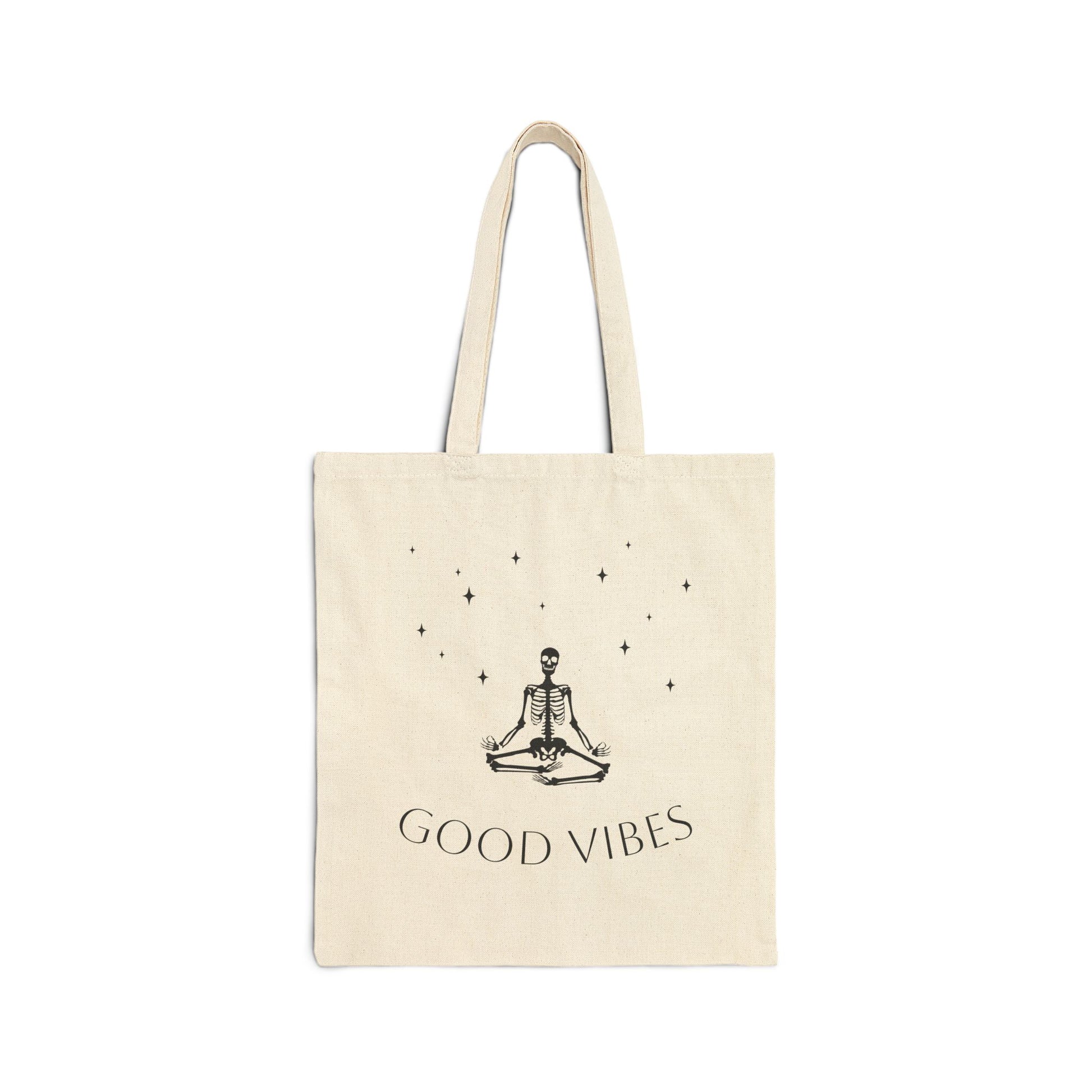 Double Sided Cotton Canvas Halloween Skeleton Good Vibes Tote Book Bag